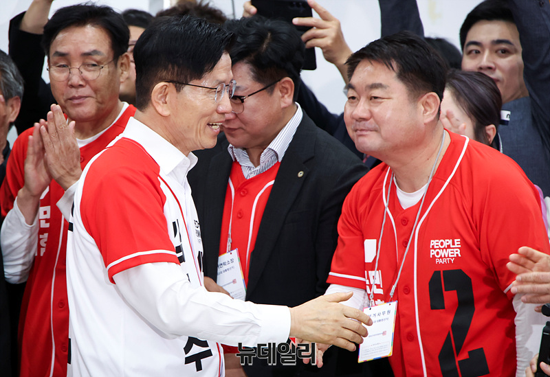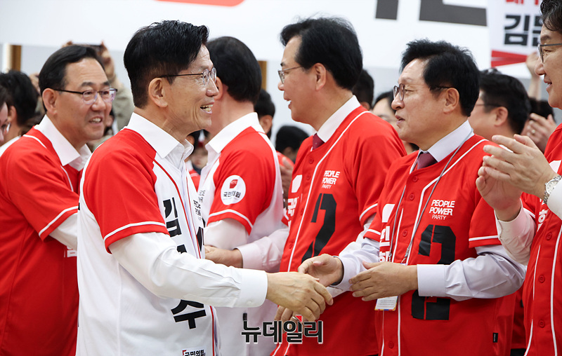김문수 국민의힘 대선 후보가 13일 오전 국민의힘 대구시당에서 열린 대구경북선거대책위원회 출정식 및 임명장 수여식에 참석하며 인사를 나누고 있다.