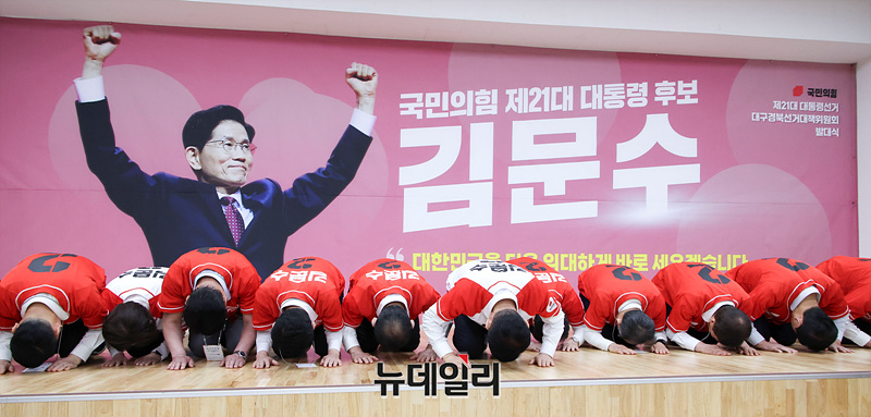 김문수 국민의힘 대선 후보를 비롯한 의원들이 13일 오전 국민의힘 대구시당에서 열린 대구경북선거대책위원회 출정식 및 임명장 수여식에서 큰절을 하고 있다.