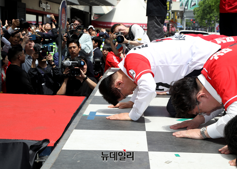 김문수 국민의힘 대선후보가 공식 선거운동 이틀째인 13일 울산 중구 뉴코아아우렛을 찾아 지지자들에게 큰절을 올리고 있다. (사진=김문수 캠프)