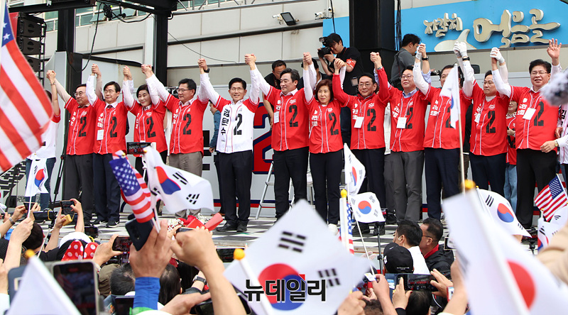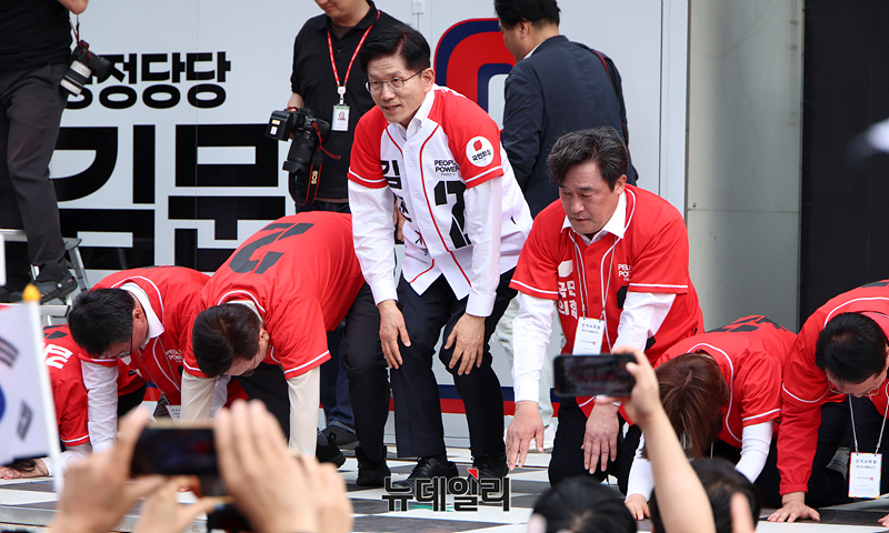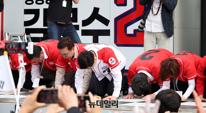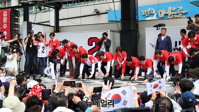 김문수 국민의힘 대선 후보와 부산 지역구 의원들이 13일 오후 부산 중구 자갈치 시장에서 열린 유세현장에서 부산시민을 향해 큰절을 하고 있다. (부산=서성진 기자)