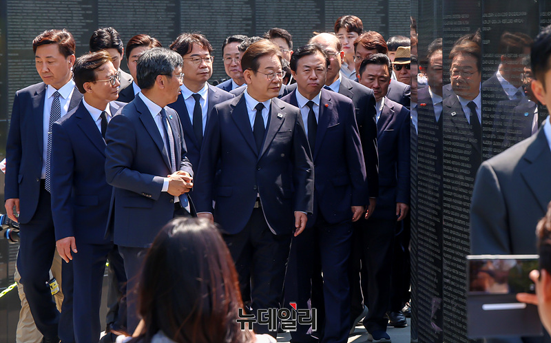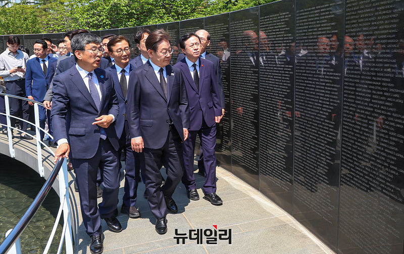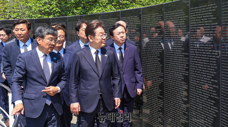이재명 더불어민주당 대선 후보가 6·3 대선 공식 선거운동 사흘째인 14일 오전 부산 유엔기념공원을 찾아 위령탑을 둘러보고 있다.