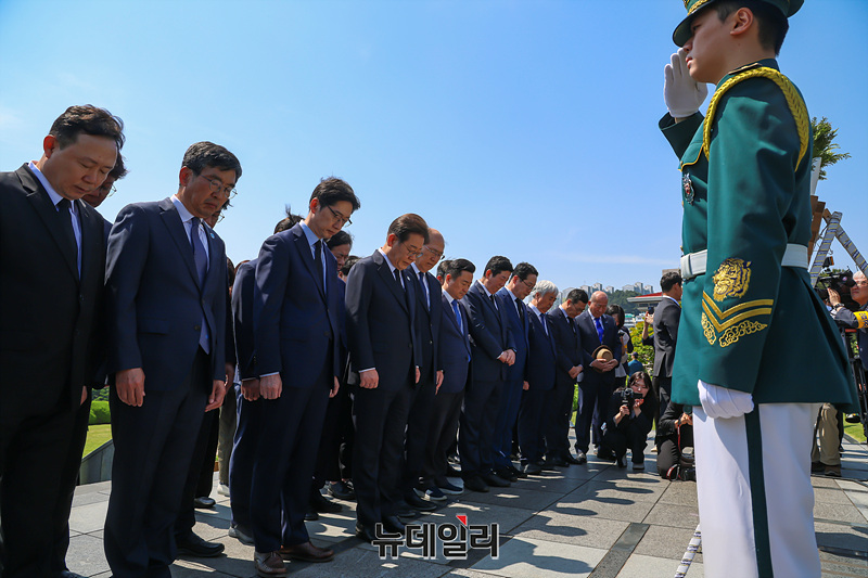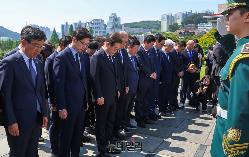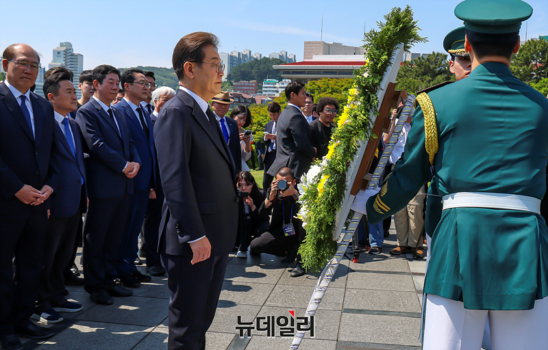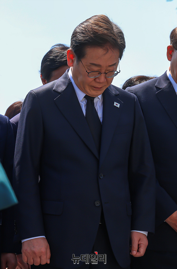 이재명 더불어민주당 대선 후보가 6·3 대선 공식 선거운동 사흘째인 14일 오전 부산 유엔기념공원을 찾아 참배하고 있다.