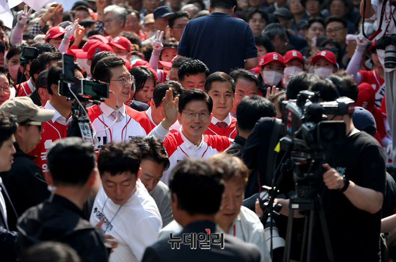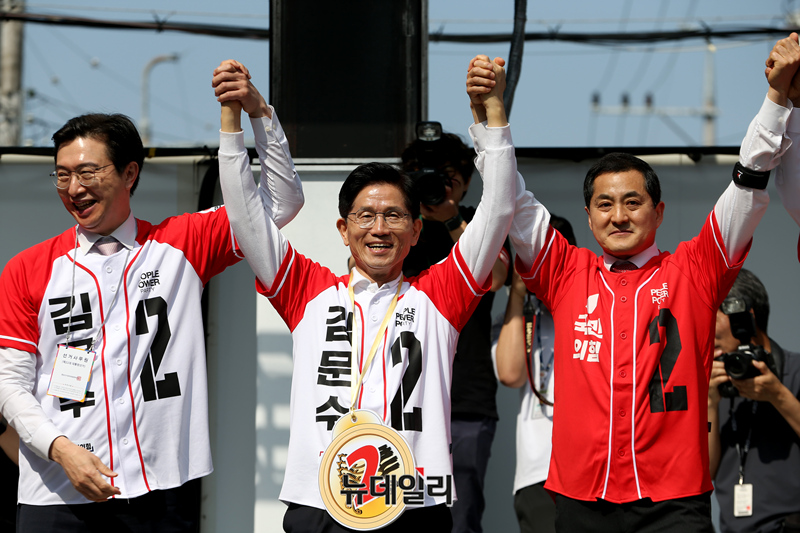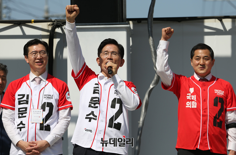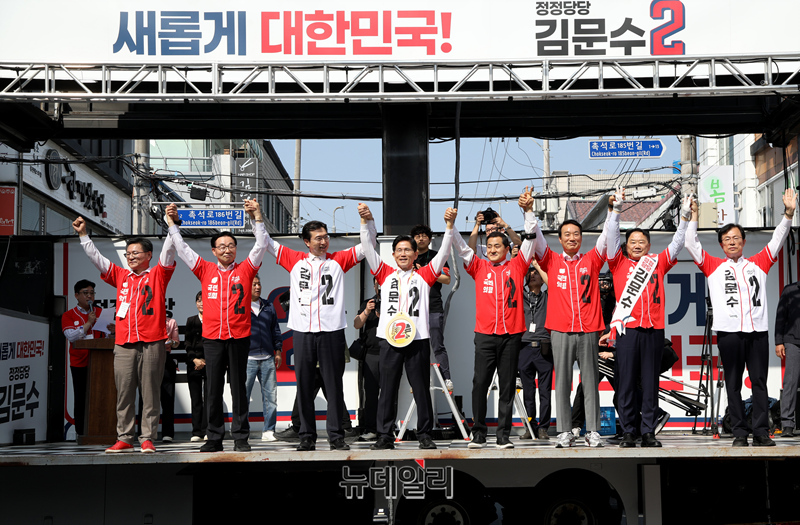 김문수 국민의힘 대선 후보가 6·3 대선 공식 선거운동 사흘째인 14일 오전 첫 일정으로 박대출(진주갑), 강민국(진주을) 국회의원과 경남 진주중앙시장을 찾아 지지 호소를 하고 있다. 김 후보는 이날 경남 지역을 돌며 유세 일정을 이어갈 예정이다. (사진=김문수 캠프)