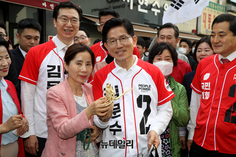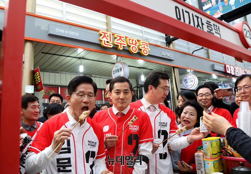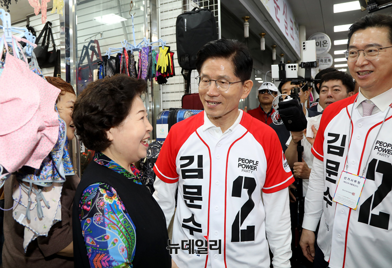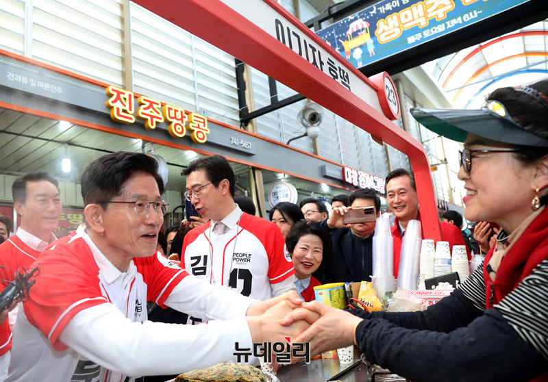 김문수 국민의힘 대선 후보가 6·3 대선 공식 선거운동 사흘째인 14일 오전 첫 일정으로 박대출(진주갑), 강민국(진주을) 국회의원과 경남 진주중앙시장을 찾아 지지 호소를 하고 있다. 김 후보는 이날 경남 지역을 돌며 유세 일정을 이어갈 예정이다. (사진=김문수 캠프)
