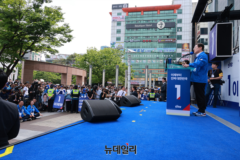 이재명 더불어민주당 대선 후보가 6·3 대선 공식 선거운동 사흘째인 14일 오후 경남 창원시 상남분수광장에서 열린 집중유세에서 지지호소를 하고 있다.