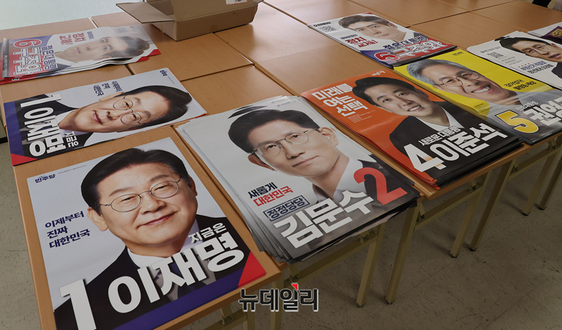 서울시중구선거관리위원회 관계자들이 제21대 대통령선거를 20일 앞둔 14일 오후 선관위에서 접수된 후보들의 선거 벽보를 살펴보고 있다.