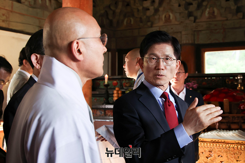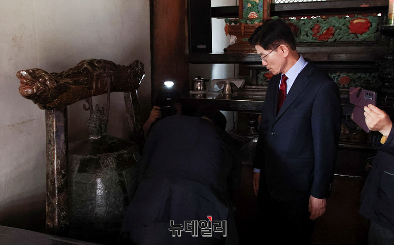김문수 국민의힘 대선 후보가 6·3 대선 공식 선거운동 사흘째인 14일 오후 경남 양산시 통도사 대웅전을 둘러보고 있다.