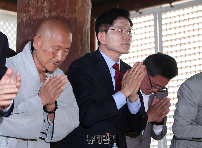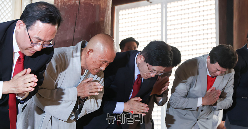 김문수 국민의힘 대선 후보가 6·3 대선 공식 선거운동 사흘째인 14일 오후 경남 양산시 통도사 대웅전에서 절하고 있다.