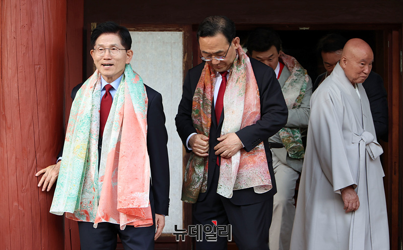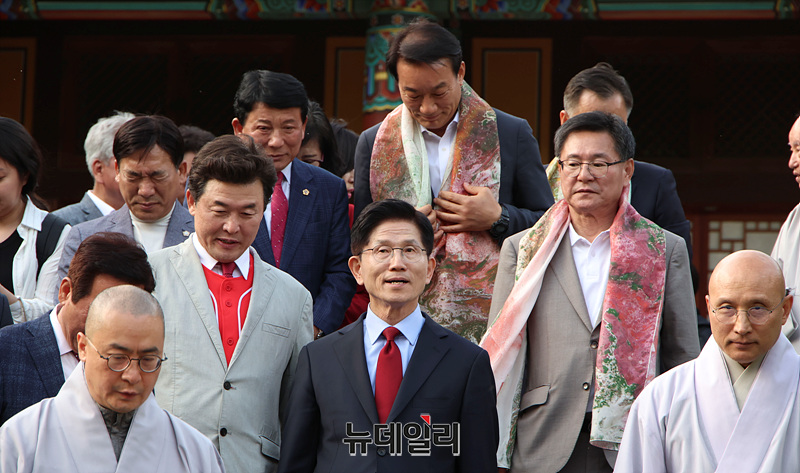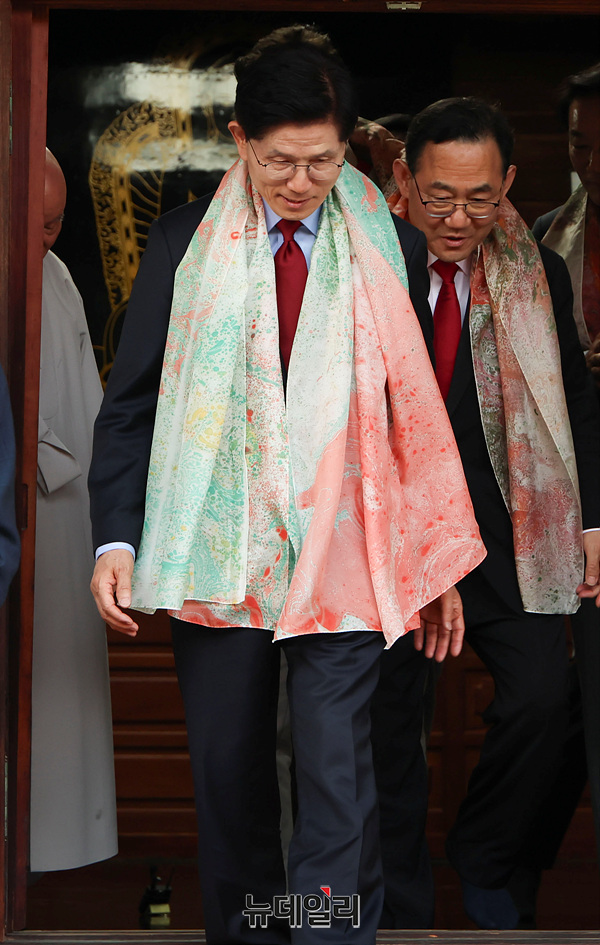 김문수 국민의힘 대선 후보가 6·3 대선 공식 선거운동 사흘째인 14일 오후 경남 양산시 통도사에서 대한불교조계종 종정 중봉 성파 대종사 예방을 마치고 자리를 나서고 있다.