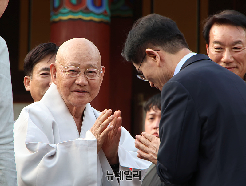 김문수 국민의힘 대선 후보와 대한불교조계종 종정 중봉 성파 대종사가 6·3 대선 공식 선거운동 사흘째인 14일 오후 경남 양산시 통도사 방문을 마치고 인사를 나누고 있다.
