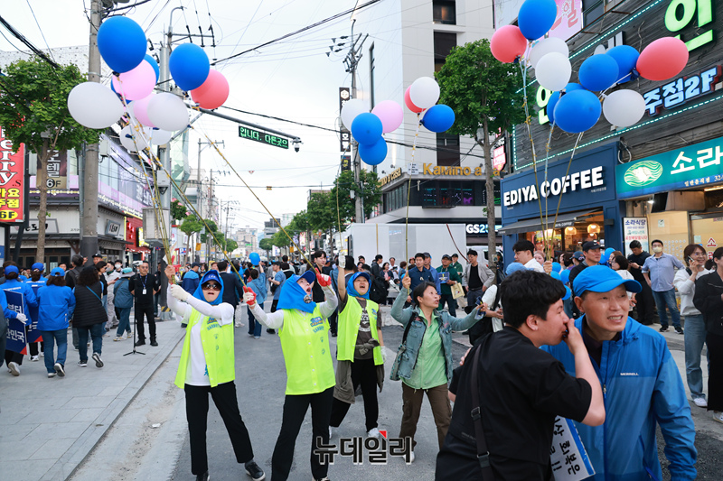 이재명 더불어민주당 대선 후보가 6·3 대선 공식 선거운동 사흘째인 14일 오후 경남 거제시 고현로에서 열린 집중유세에서 발언을 하고 있는 가운데 지지자들이 환호하고 있다. (경남 거제=이종현 기자)