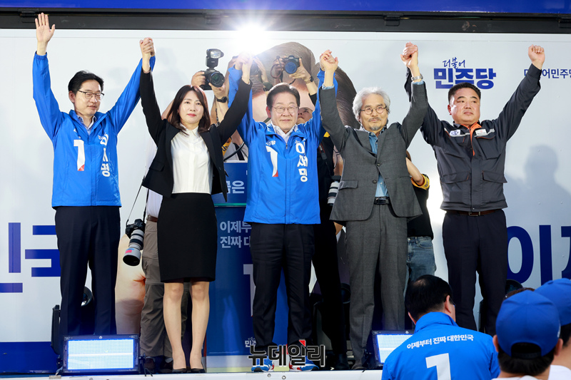 이재명 더불어민주당 대선 후보가 6·3 대선 공식 선거운동 사흘째인 14일 오후 경남 거제시 고현로에서 열린 집중유세에서 당원들과 손을 들어 인사하고 있다. (경남 거제=이종현 기자)