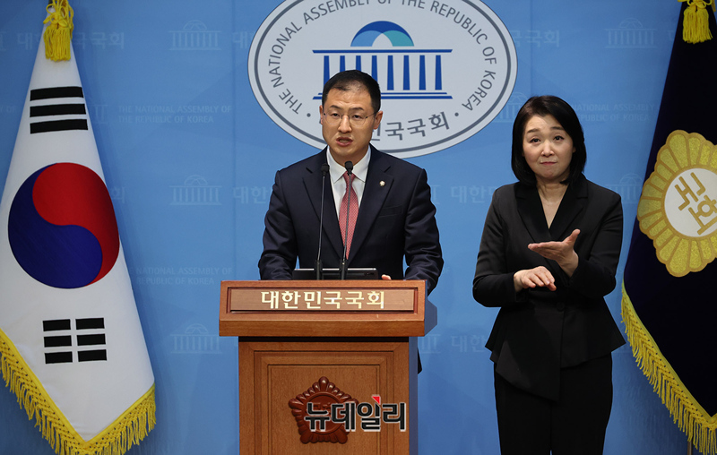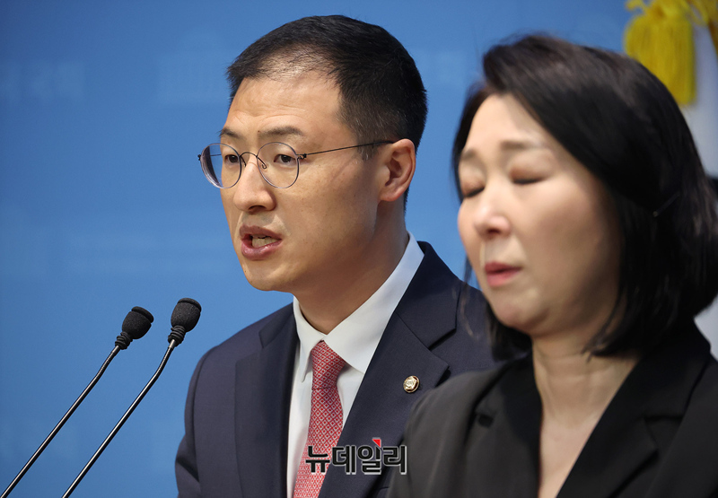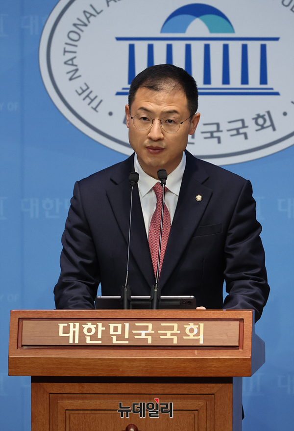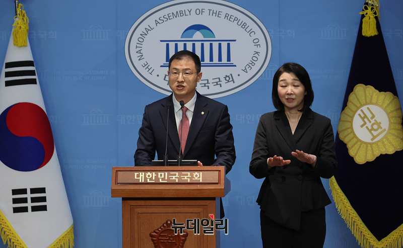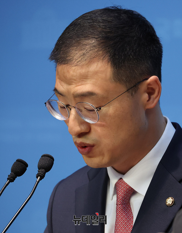 국민의힘을 탈당한 김상욱 무소속 의원이 15일 오전 국회 기자회견장에서 이재명 더불어민주당 대선 후보를 공개지지하는 기자회견을 갖고 있다.