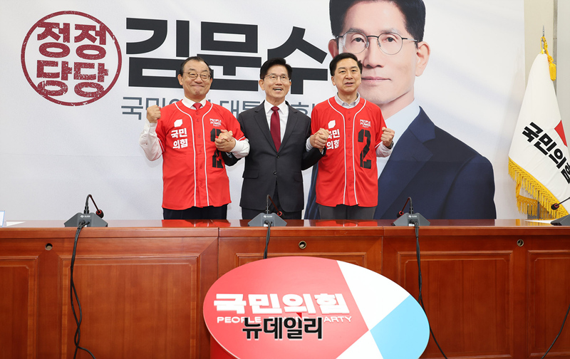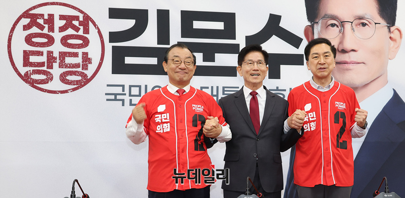 김문수 국민의힘 대선 후보가 15일 오전 국회에서 열린 국민의힘 중앙선대위 회의에서 김기현 의원, 이정현 전의원에게 공동선대위원장 임명장을 수여하고 기념촬영을 하고 있다.