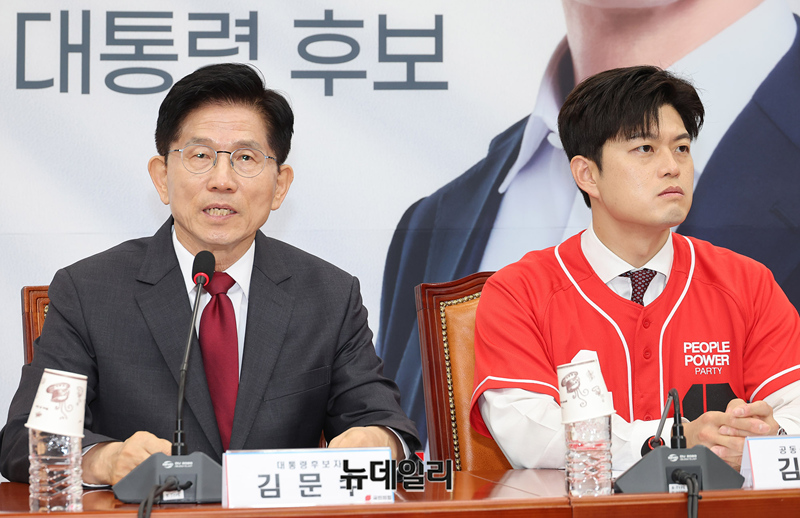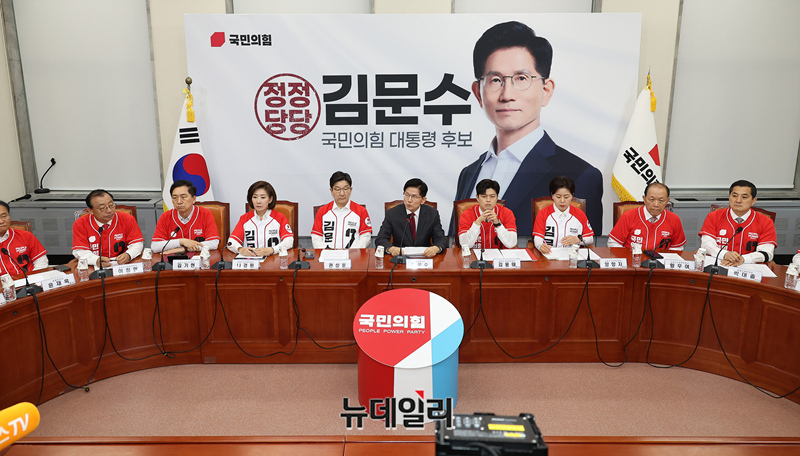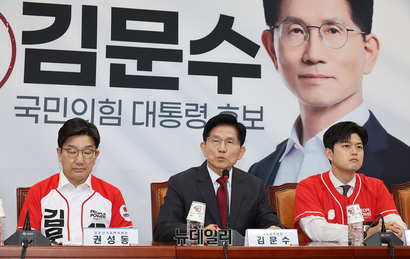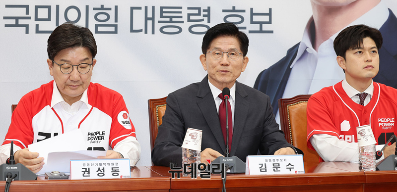 김문수 국민의힘 대선후보가 15일 오전 국회에서 열린 중앙선대위 회의에 참석해 발언하고 있다. 이날 회의에는 김 후보가 김기현 의원, 이정현 전 의원에게 각각 공동선대위원장 임명장을 수여했다.