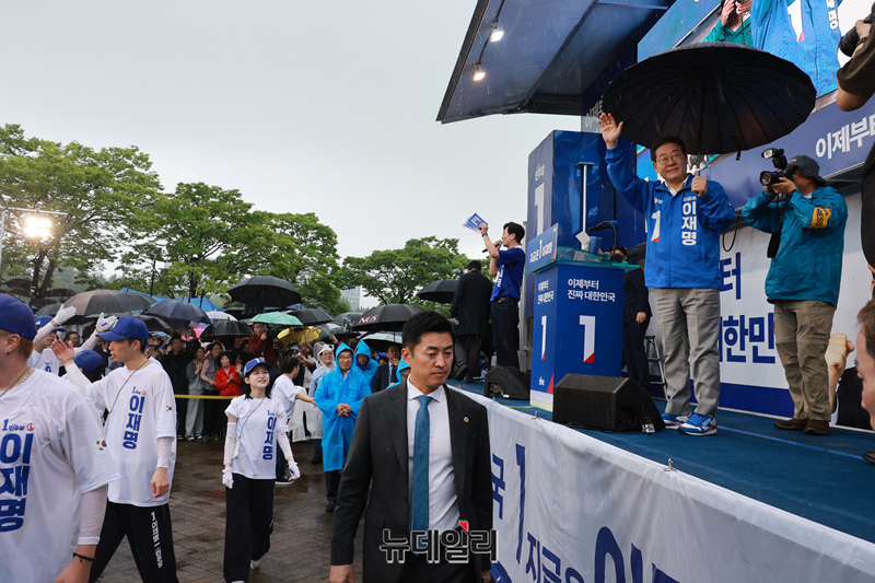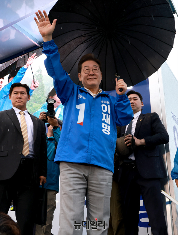 이재명 더불어민주당 대선 후보가 6·3 대선 공식 선거운동 닷새째인 15일 오후 전남 광양 전남드래곤즈구장 열린 유세에서 지지자들에게 인사를 하고 있다. (전남 광양=이종현 기자)