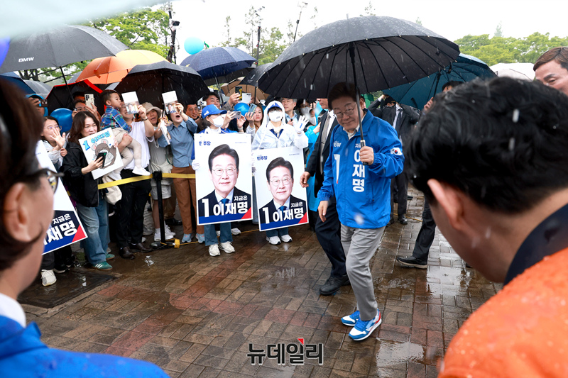 이재명 더불어민주당 대선 후보가 6·3 대선 공식 선거운동 닷새째인 15일 오후 전남 광양 전남드래곤즈구장 열린 유세에 참석하고 있다. (전남 광양=이종현 기자)
