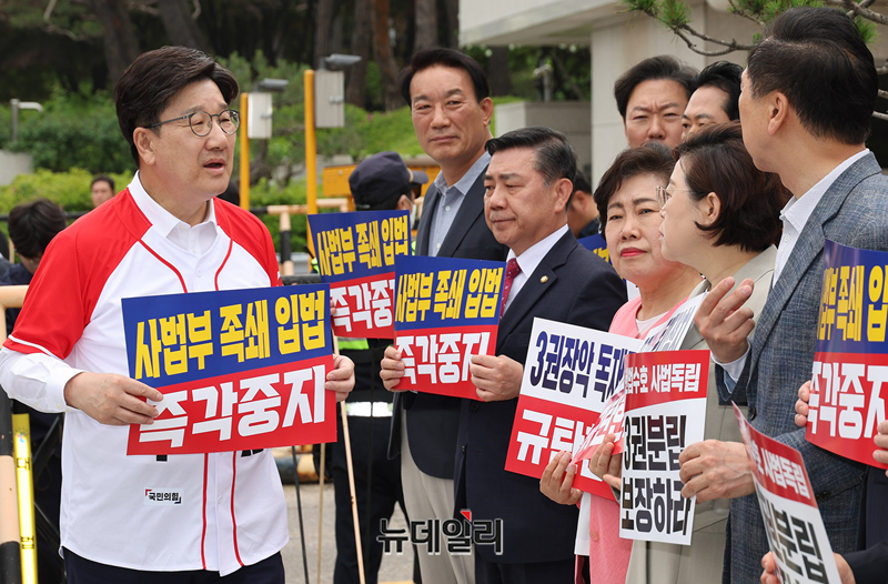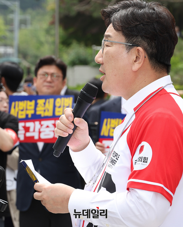 권성동 국민의힘 원내대표가 15일 오후 서울 서초구 대법원 정문 앞에서 열린 사법부 수호 및 민주당 규탄대회에서 발언하고 있다.
