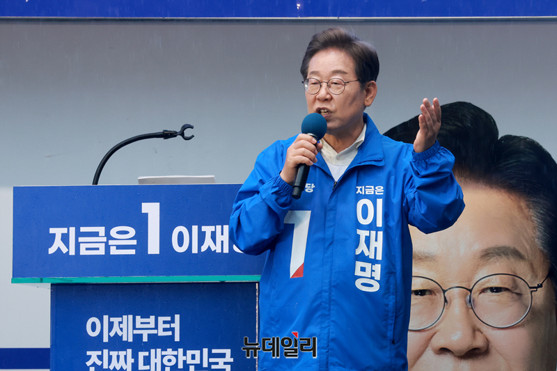이재명 더불어민주당 대선 후보가 6·3 대선 공식 선거운동 닷새째인 15일 전남 순천시 연향동 패션의 거리에서 열리 선거 유세에서 지지를 호소하고 있다. (전남 순천=이종현 기자)