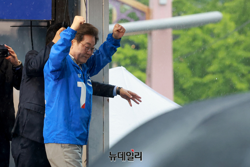 이재명 더불어민주당 대선 후보가 6·3 대선 공식 선거운동 닷새째인 15일 전남 순천시 연향동 패션의 거리에서 열리 선거 유세에서 시민들에게 인사를 하고 있다. (전남 순천=이종현 기자)