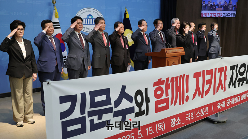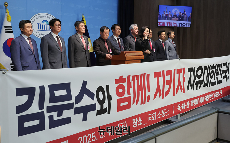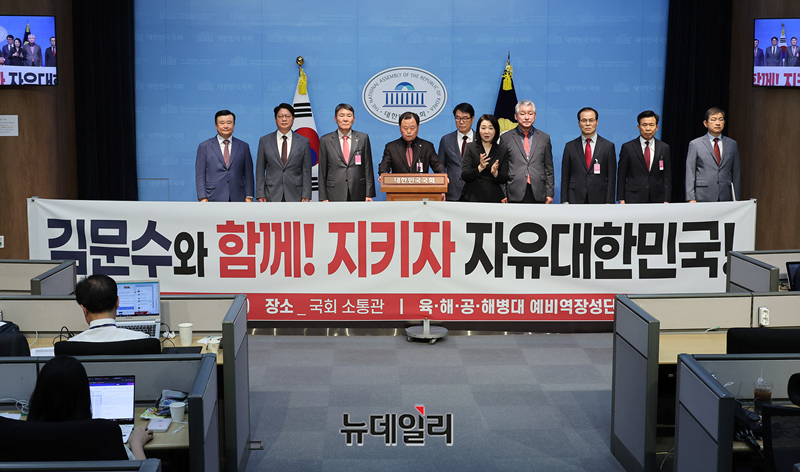 육·해·공군·해병대 예비역장성단이 15일 오전 국회 소통관에서 김문수 국민의힘 대선 후보 지지선언 기자회견을 진행하고 있다.