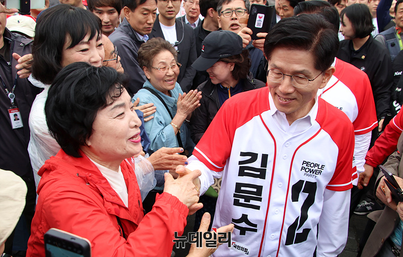김문수 국민의힘 대선 후보가 6·3 대선 공식 선거운동 닷새째인 16일 오전 경기 수원시 지동시장에서 열린 유세현장에서 시민들과 인사를 나누고 있다.