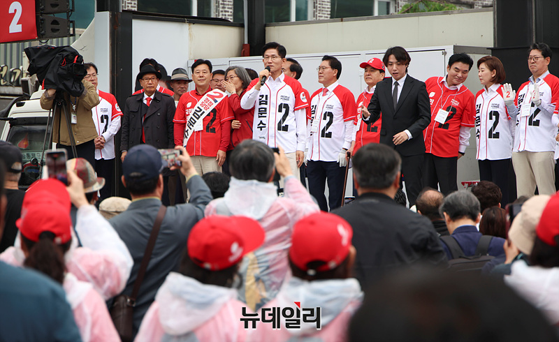6·3 대선 공식 선거운동 닷새째인 16일 오전 경기 수원시 지동시장에서 열린 유세현장에서 김문수 후보가 등장하자 시민들이 환호하고 있다.