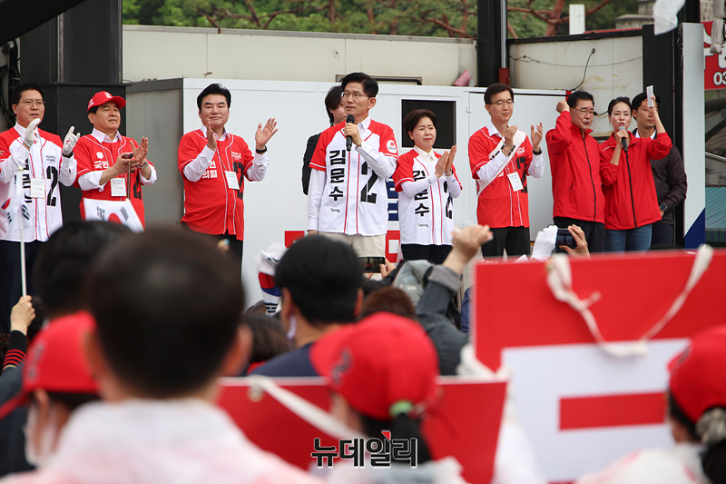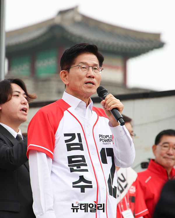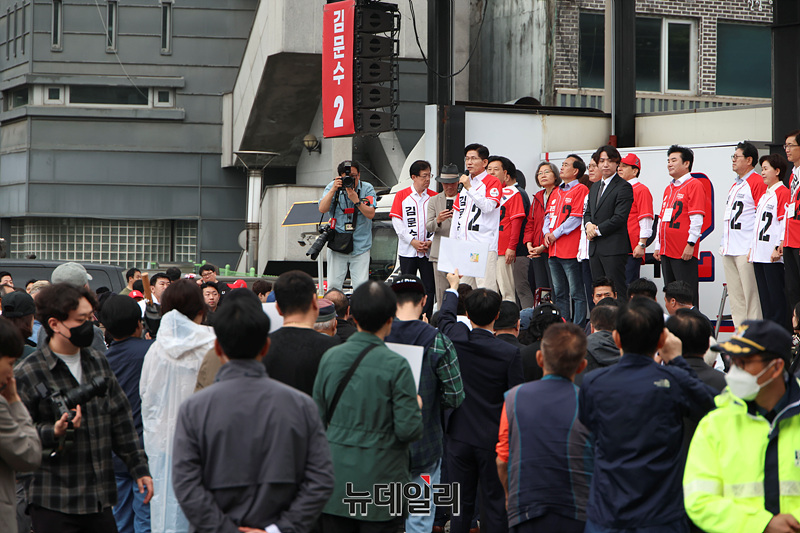 김문수 국민의힘 대선 후보가 6·3 대선 공식 선거운동 닷새째인 16일 오전 경기 수원시 지동시장에서 열린 유세현장에서 지지를 호소하고 있다.