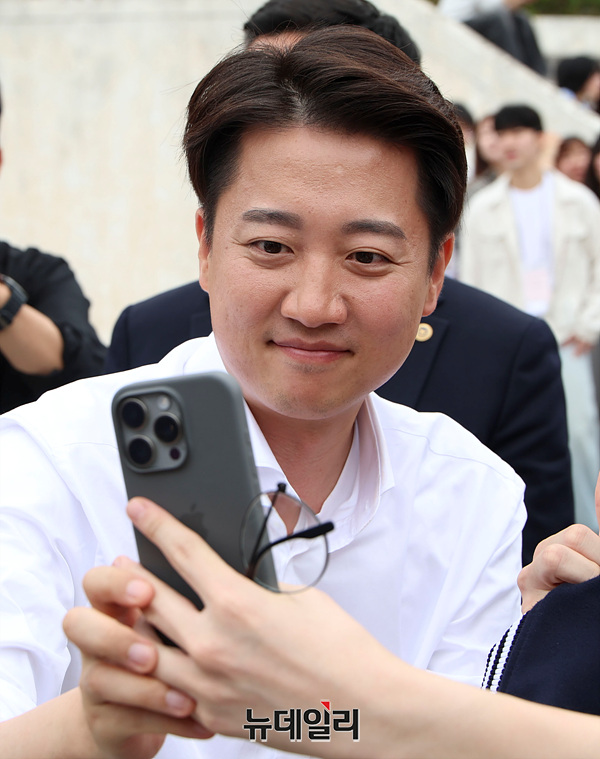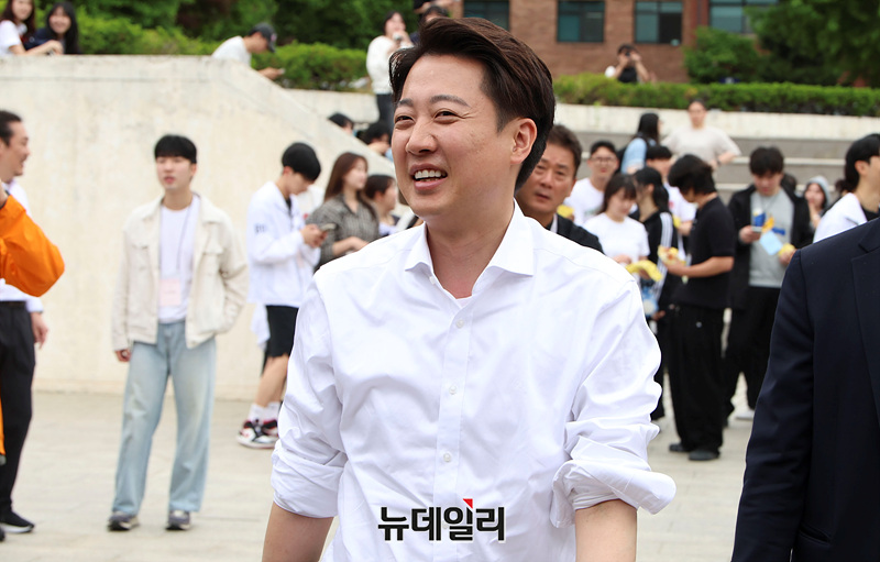 이준석 개혁신당 대선 후보가 6·3 대선 공식 선거운동 닷새째인 16일 오전 충남 천안시 단국대학교 천안캠퍼스에서 열린 '학식먹자 이준석' 행사에 참석하며 학생들과 인사를 나누고 있다.