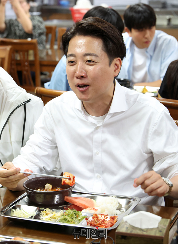 이준석 개혁신당 대선 후보가 6·3 대선 공식 선거운동 닷새째인 16일 오전 충남 천안시 단국대학교 천안캠퍼스에서 열린 '학식먹자 이준석' 행사에서 학생들과 함께 식사하고 있다.