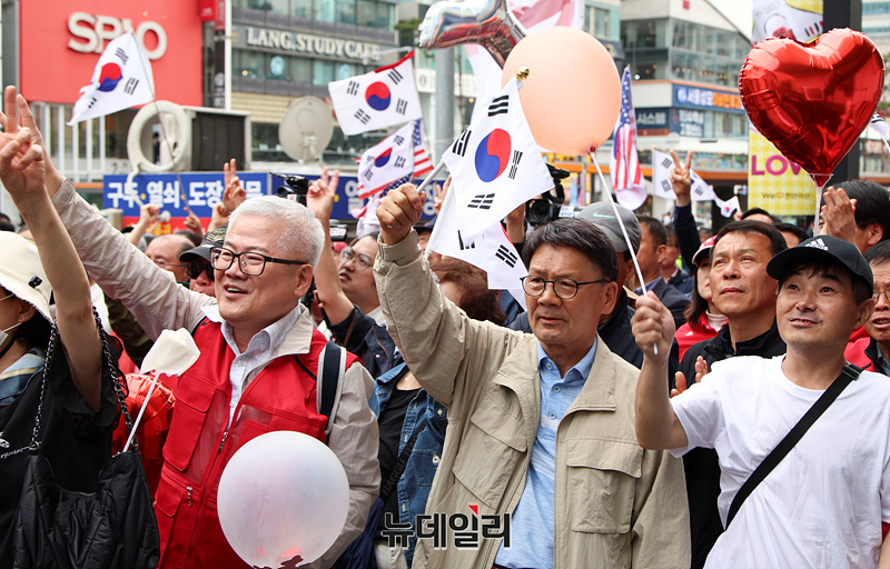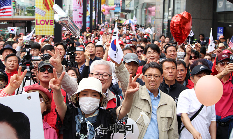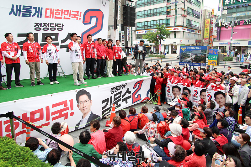 6·3 대선 공식 선거운동 닷새째인 16일 오후 충남 천안시 신세계백화점 앞에서 열린 김문수 국민의힘 대선 후보 유세현장이 지지자들로 가득 차 있다.