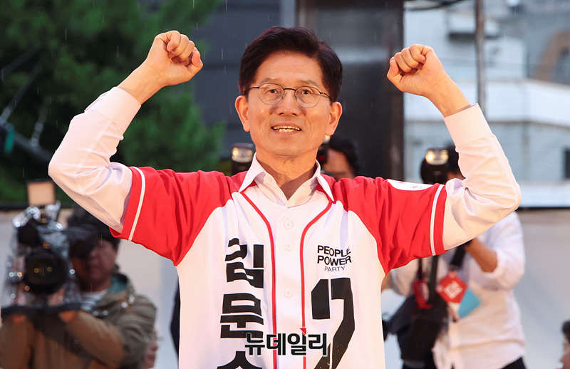 김문수 국민의힘 대선 후보가 6·3 대선 공식 선거운동 닷새째인 16일 오후 대전 중구 으능정이거리에서 열린 유세현장에서 시민들을 향해 인사하고 있다. (대전=서성진 기자)