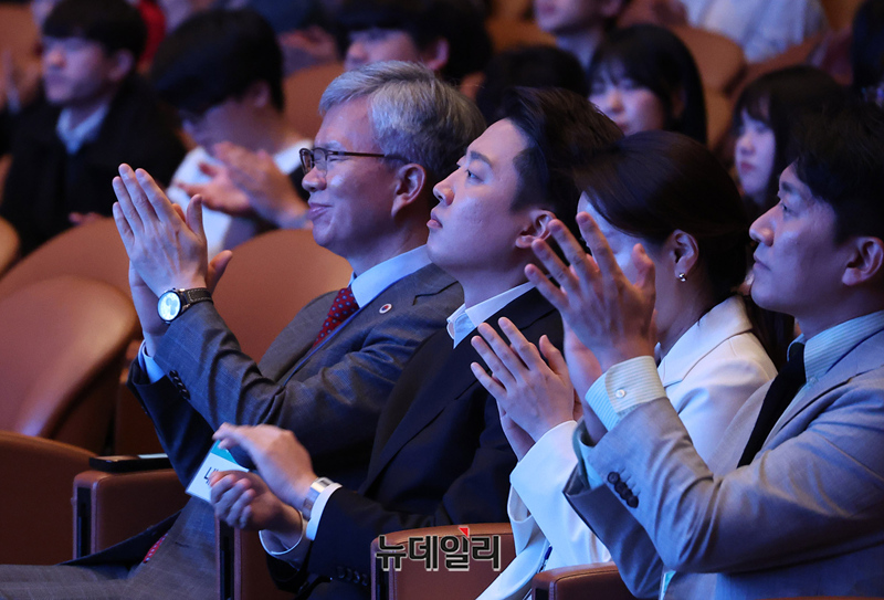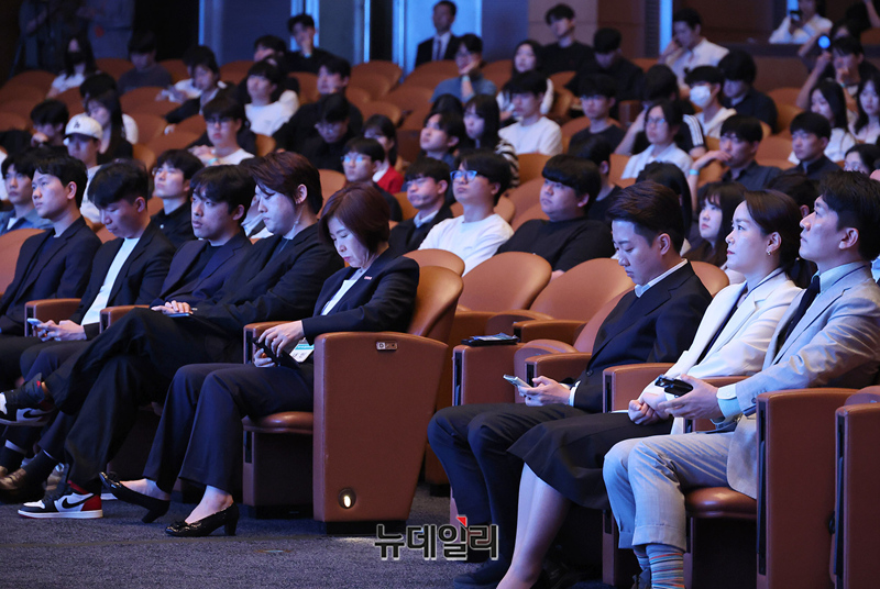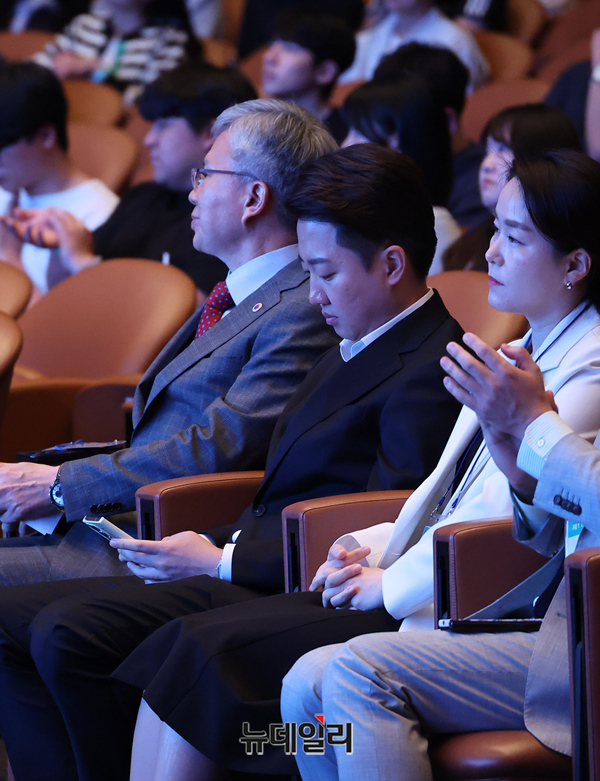 이준석 개혁신당 대선 후보가 17일 오전 서울 강남구 코엑스에서 열린 제11회 젊은의사포럼에 참석해 윤석열 전 대통령의 국민의힘 탈당 속보를 휴대폰으로 확인하고 있다.