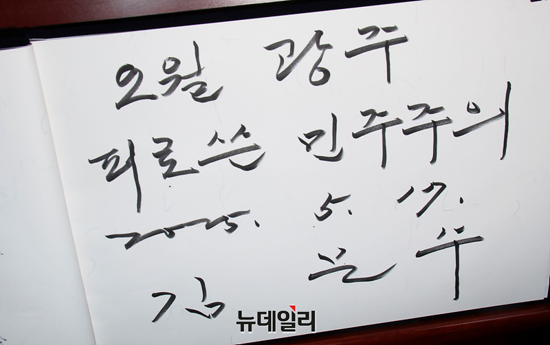 김문수 국민의힘 대선 후보가 6·3 대선 공식 선거운동 첫 주말인 17일 오전 광주 국립5.18민주묘지에서 방명록을 작성하고 있다.