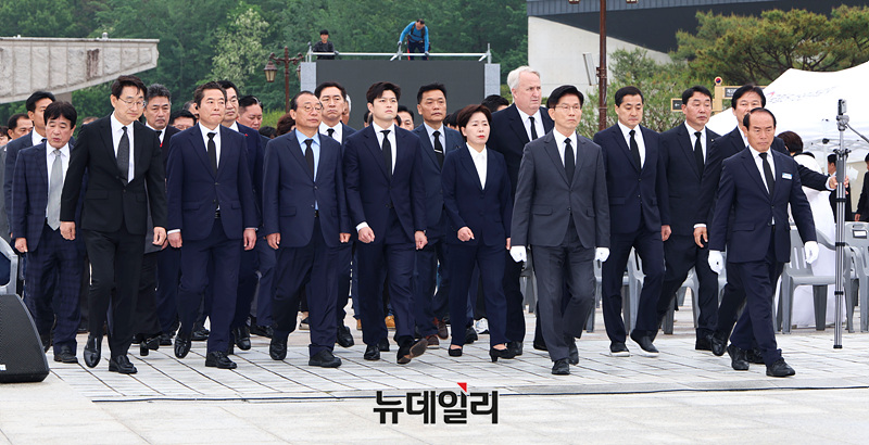김문수 국민의힘 대선 후보와 김용태 비상대책위원장이 6·3 대선 공식 선거운동 첫 주말인 17일 오전 광주 국립5.18민주묘지를 향해 이동하고 있다.