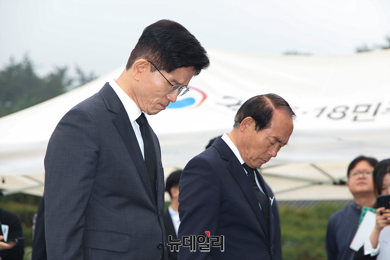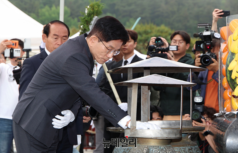 김문수 국민의힘 대선 후보가 6·3 대선 공식 선거운동 첫 주말인 17일 오전 광주 국립5.18민주묘지에서 분향하고 있다.