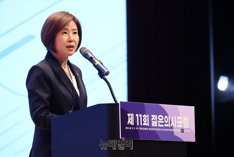 김미애 국민의힘 의원이 17일 오전 서울 강남구 코엑스에서 열린 제11회 젊은의사포럼에서 축사를 하고 있다.