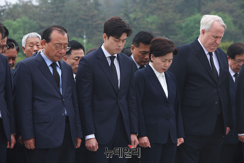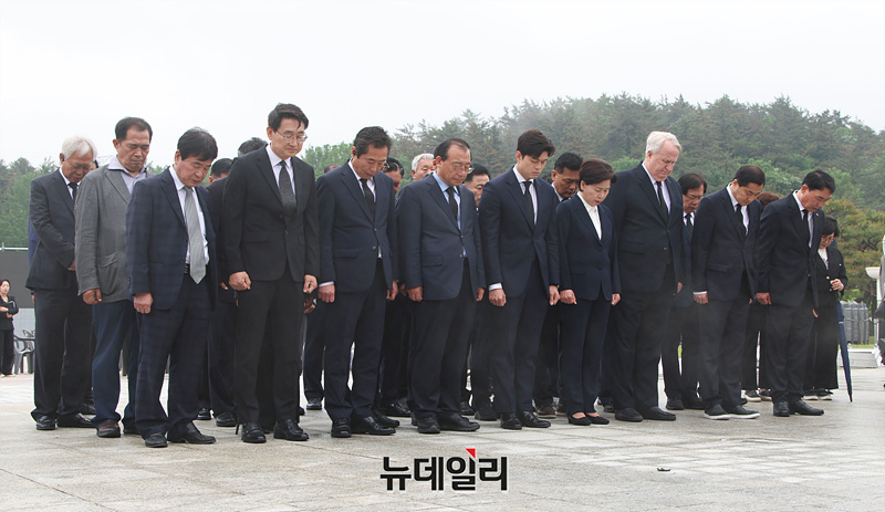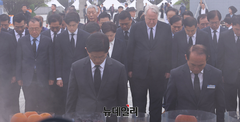 김용태 국민의힘 비상대책위원장을 비롯한 참석자들이 6·3 대선 공식 선거운동 첫 주말인 17일 오전 광주 국립5.18민주묘지에서 묵념하고 있다.