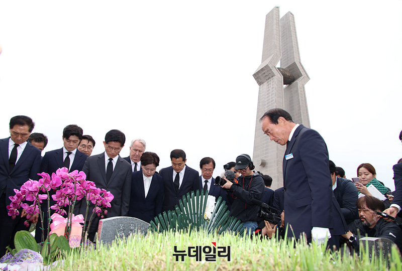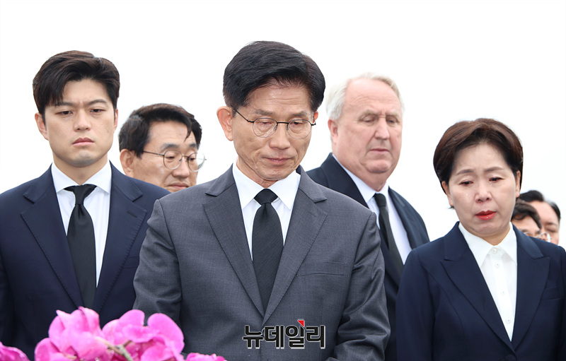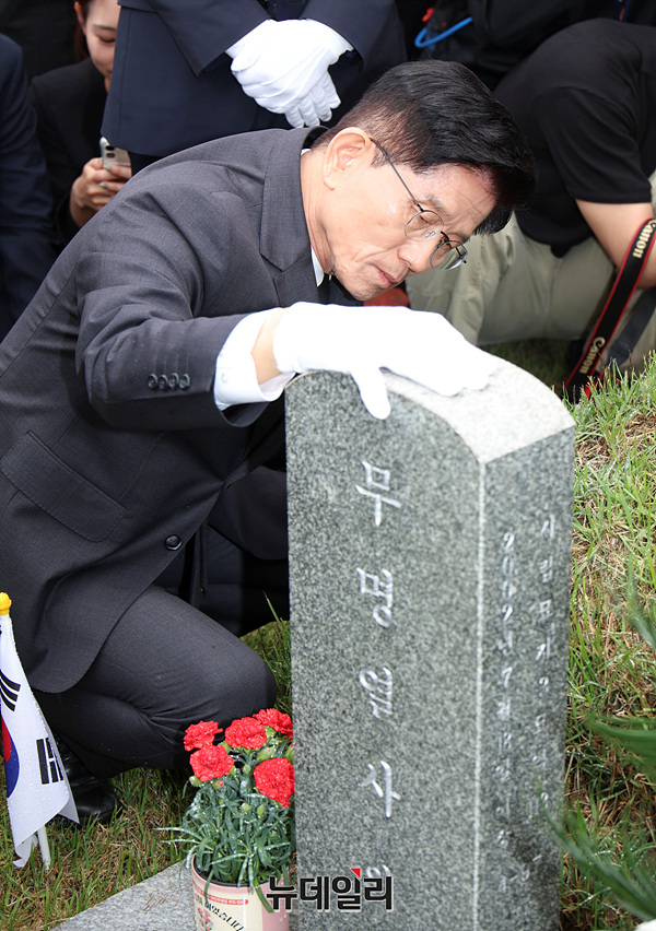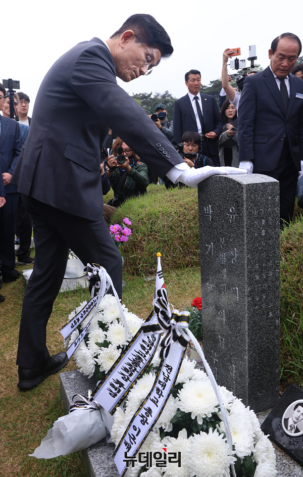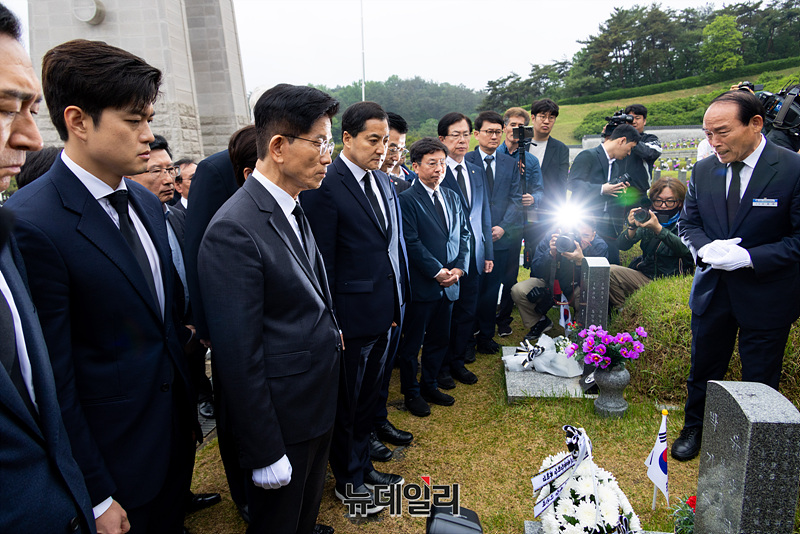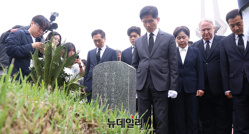 김문수 국민의힘 대선 후보가 6·3 대선 공식 선거운동 첫 주말인 17일 오전 광주 국립5.18민주묘지에서 참배하고 있다.