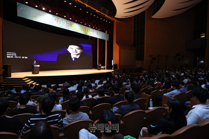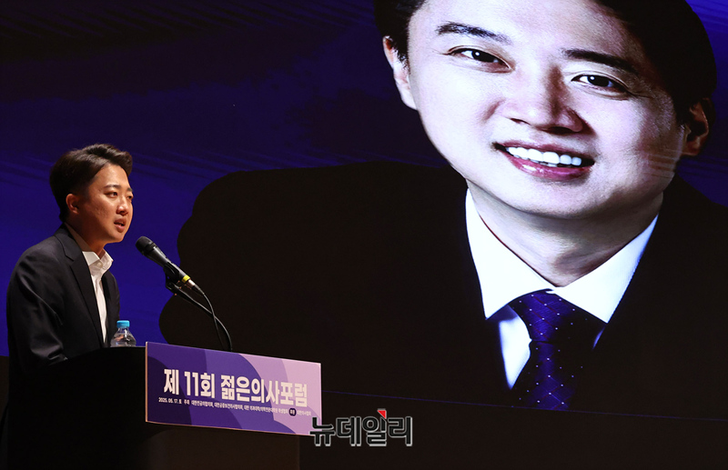 이준석 개혁신당 대선 후보가 공식 선거운동 첫 주말인 17일 오전 서울 강남구 코엑스에서 열린 제11회 젊은의사포럼에서 강연자로 나서 발언하고 있다.