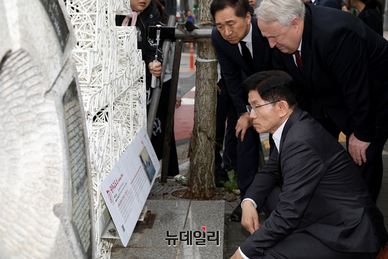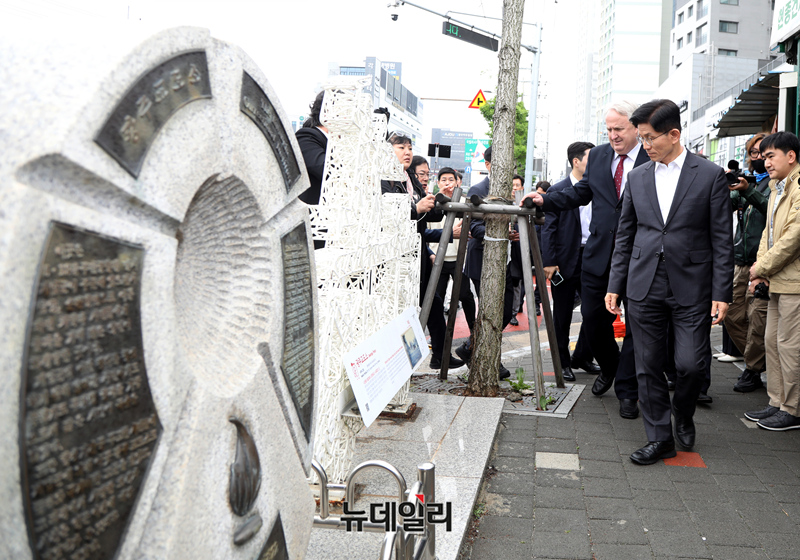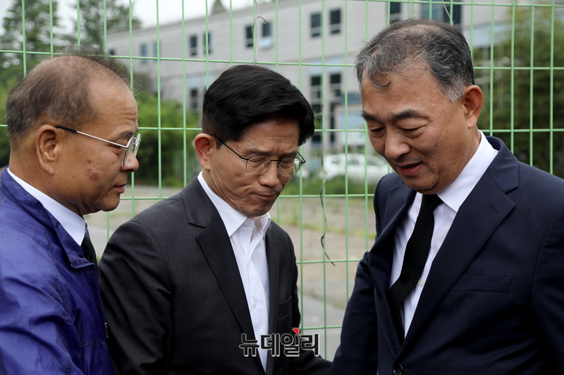 광주지역을 방문중인 김문수 국민의힘 대선후보가 17일 오전 광주 북구 광주교도소 터를 방문해 박관현 열사를 회상하며 교도소 동기들과 지난날을 회상하고 있다. (사진=김문수 캠프)