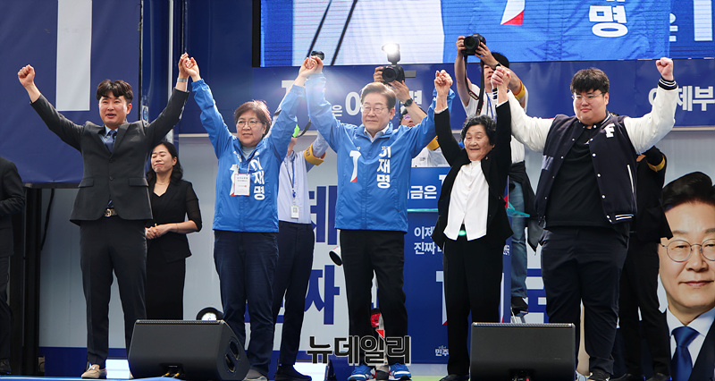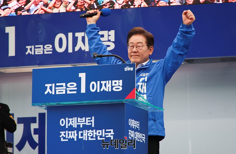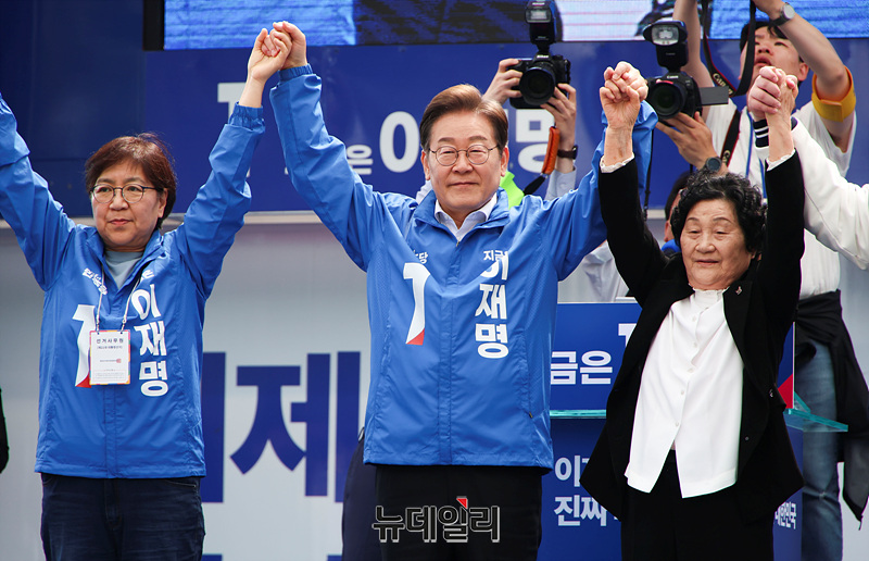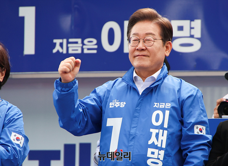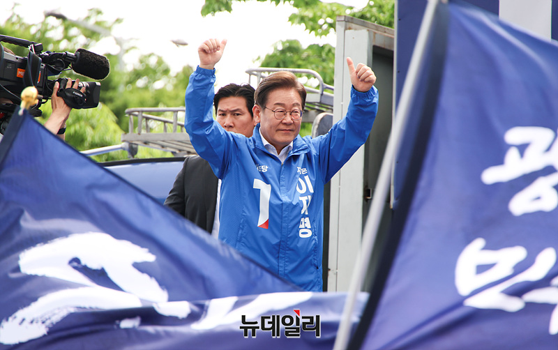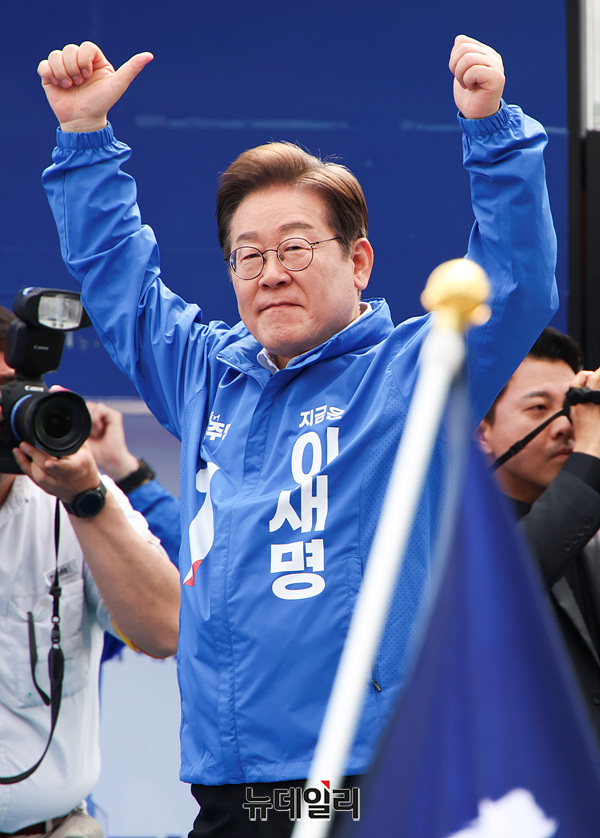 이재명 더불어민주당 대선 후보가 6·3 대선 공식 선거운동 첫 주말인 17일 오후 광주 김대중컨벤션센터에서 열린 유세 현장에서 지지자들을 향해 인사하고 있다. (광주=서성진 기자)
