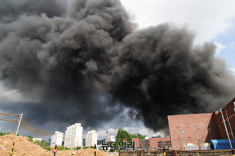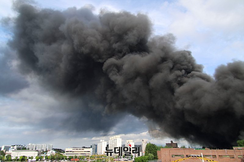 금호타이어 광주공장에 대형 화재가 발생해 국가소방동원령이 발령된 17일 오후 광주 광산구 화재현장에서 검은 연기가 하늘을 뒤덮고 있다.