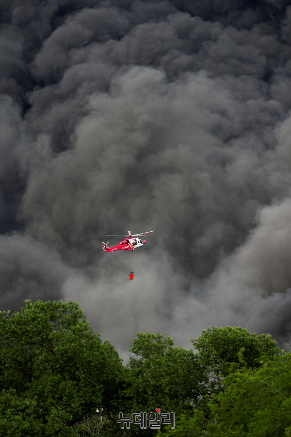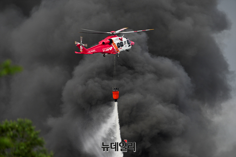 금호타이어 광주공장에 대형 화재가 발생해 국가소방동원령이 발령된 17일 오후 광주 광산구 화재현장에 소방헬기가 투입되고 있다.