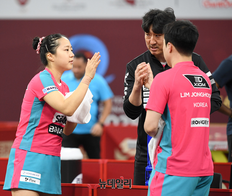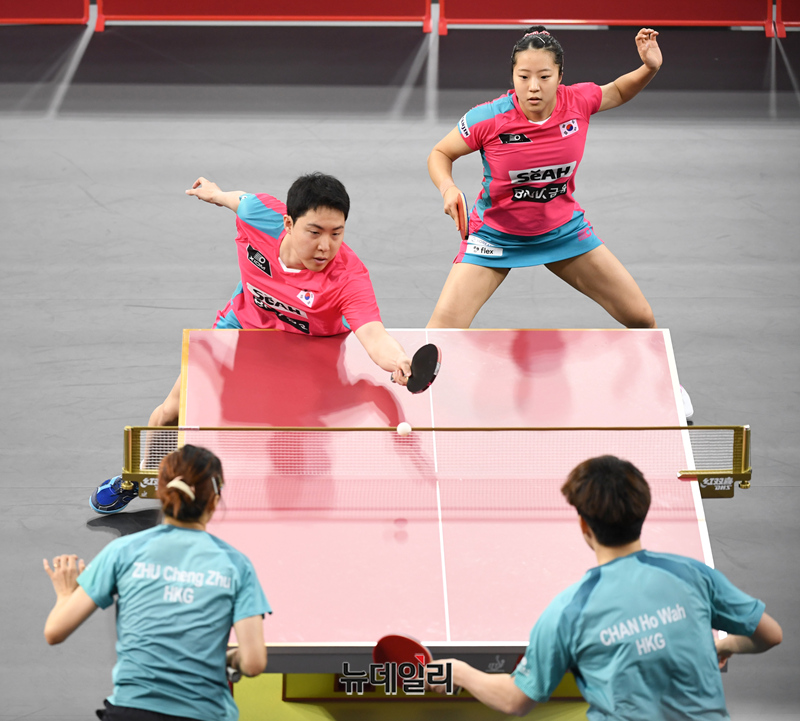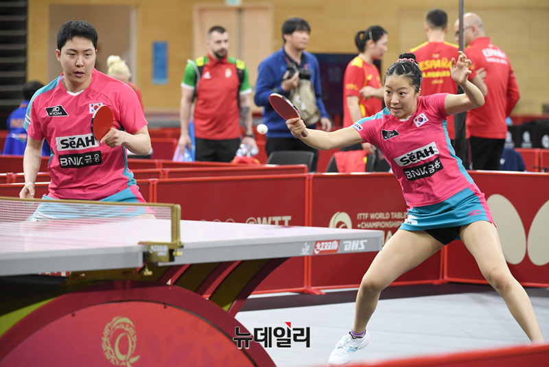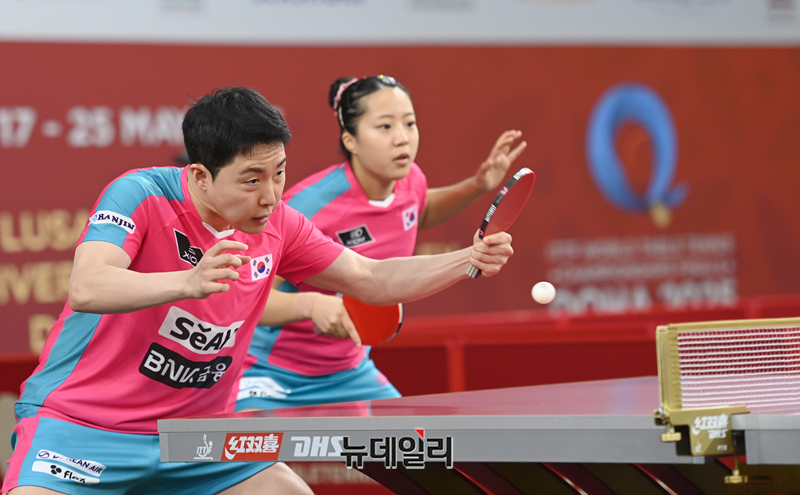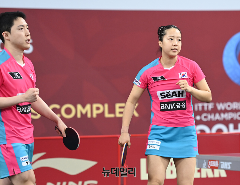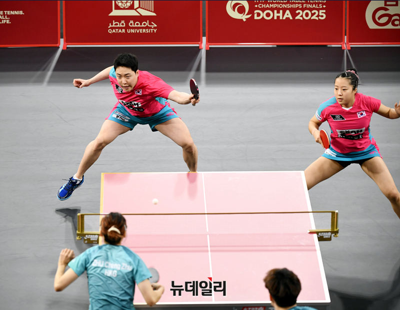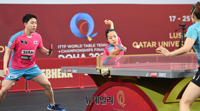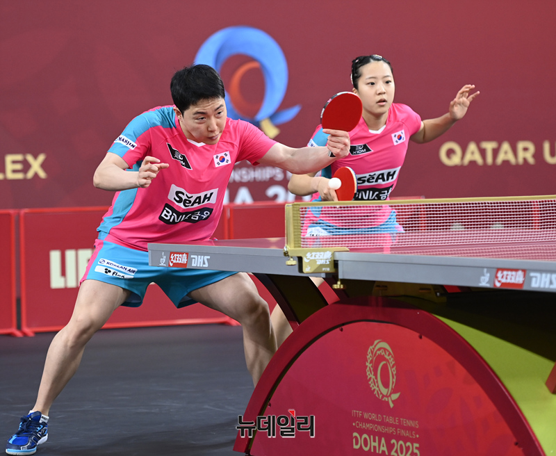 임종훈, 신유빈 선수가 18일 카타르 도하 카타르대학교 스포츠 콤플렉스에서 열린 2025 국제탁구연맹(ITTF) 세계선수권대회 혼성복식 64강 홍콩 챈 볼드윈, 주청주 조와 경기를 펼치고 있다. (사진=공동취재단)
