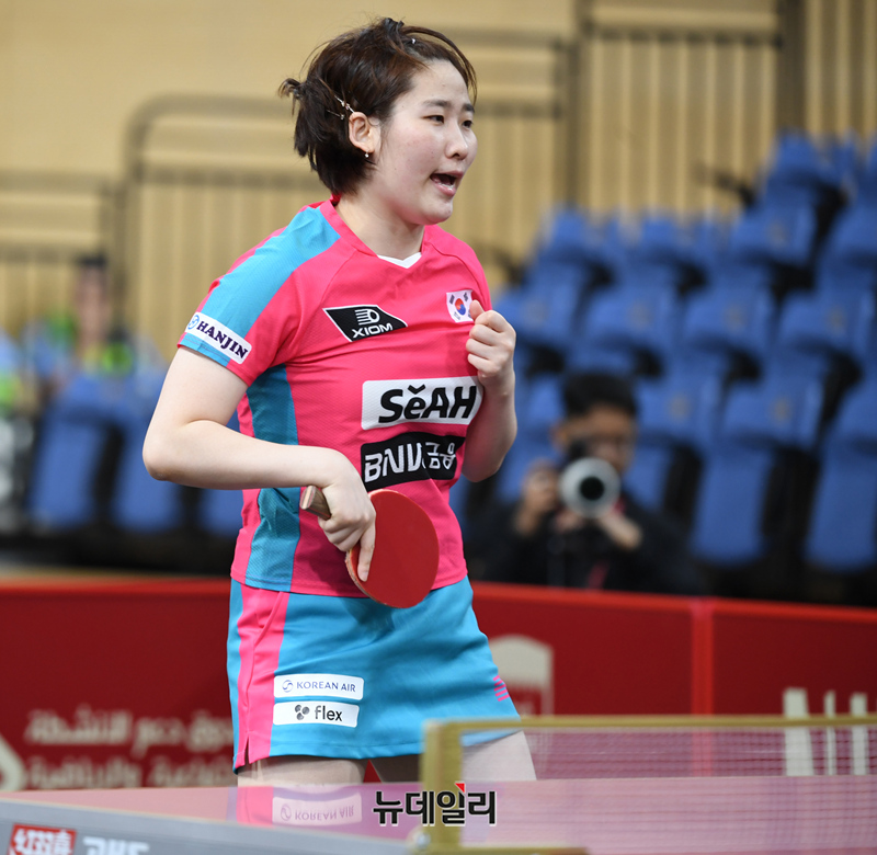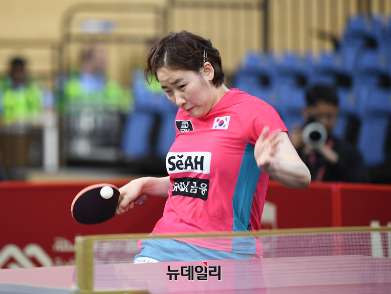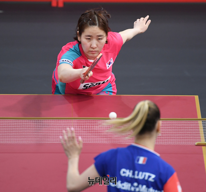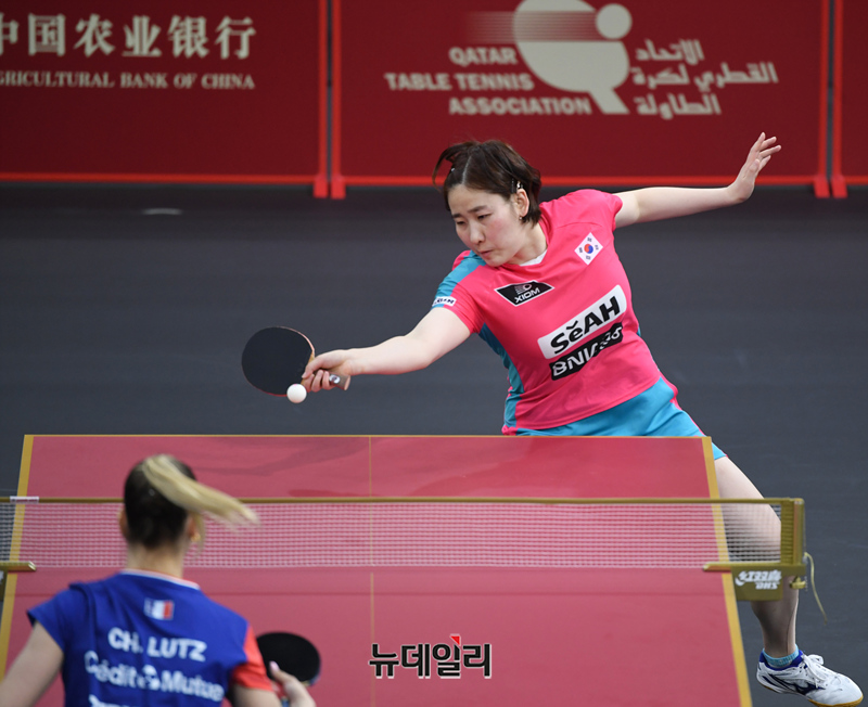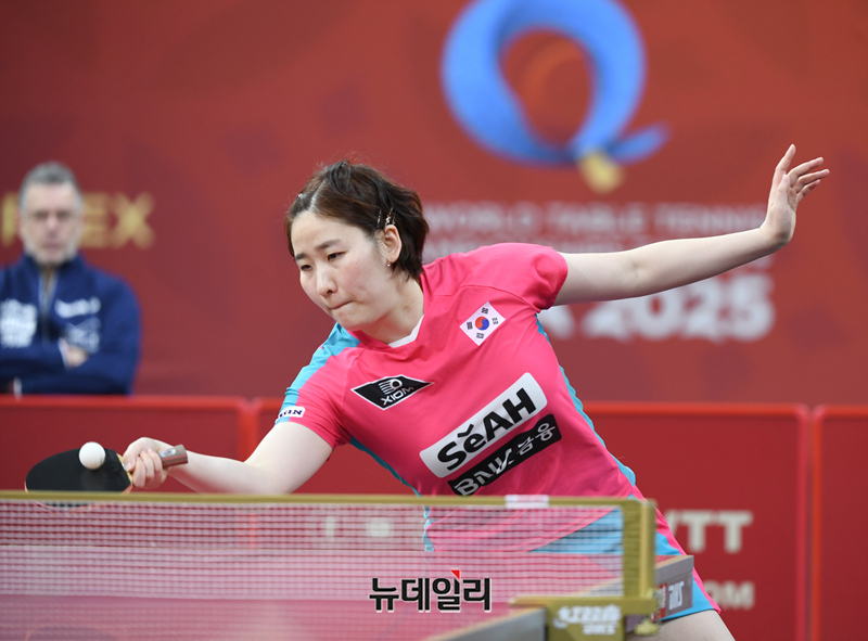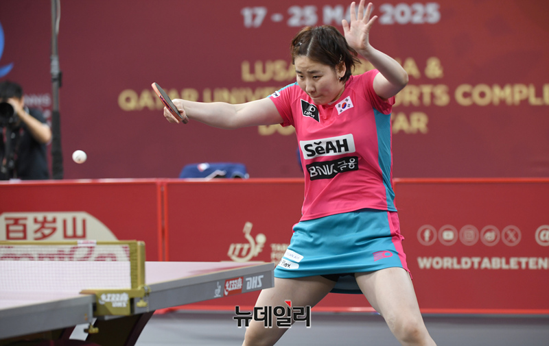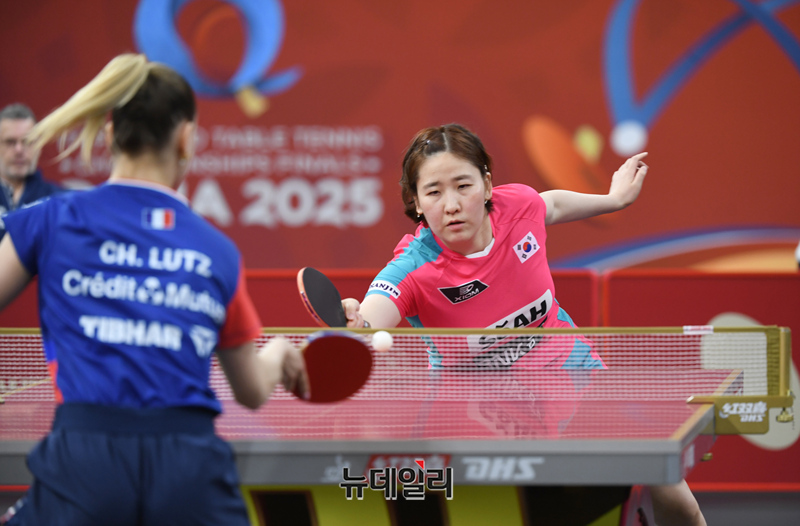 이은혜 선수가 18일 카타르 도하 카타르대학교 스포츠 콤플렉스에서 열린 2025 국제탁구연맹(ITTF) 세계선수권대회 개인단식 128강 프랑스 샤를로트 뤼츠와 경기를 펼치고 있다. (사진=공동취재단)