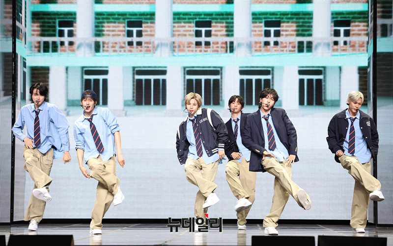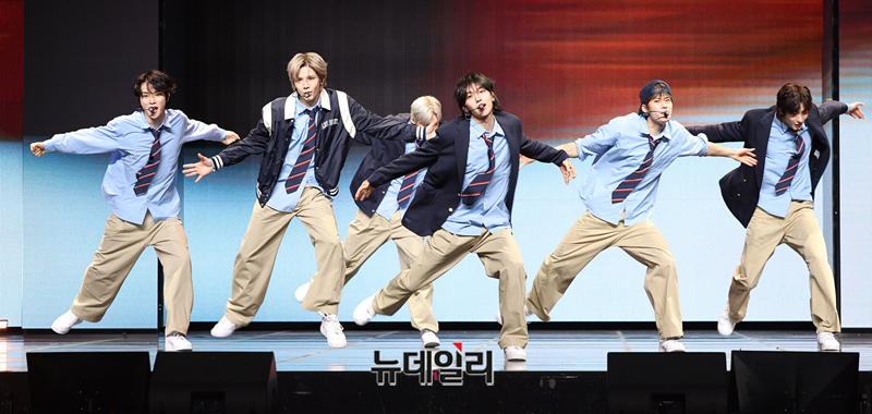 아이돌그룹 라이즈가 19일 오전 서울 용산구 블루스퀘어에서 열린 정규 1집 오딧세이 쇼케이스에서 타이틀곡 무대를 선보이고 있다.