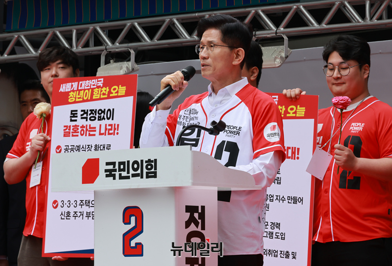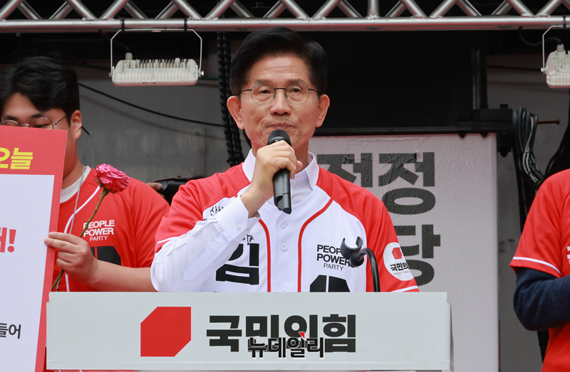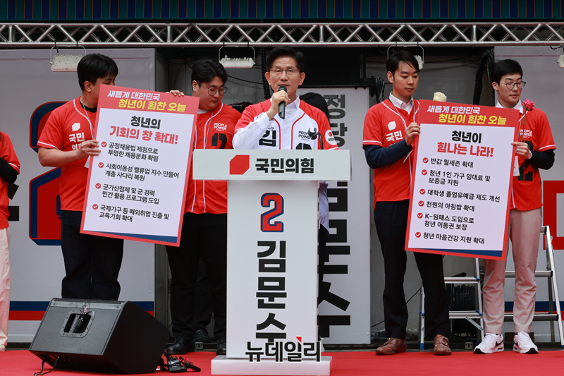 김문수 국민의힘 대통령 후보가 19일 오전 서울 중구 청계광장 소라탑 앞에서 '청년이 바라는 대한민국' 정책 공약 발표를 하고 있다.