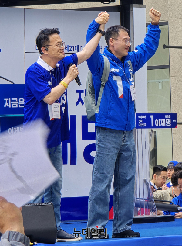 민주당에 입당한 김상욱 의원이 19일 오후 서울 용산역 광장에서 열린 이재명 더불어민주당 집중유세에서 박주민 의원과 연단에 올라 인사를 하고 있다.