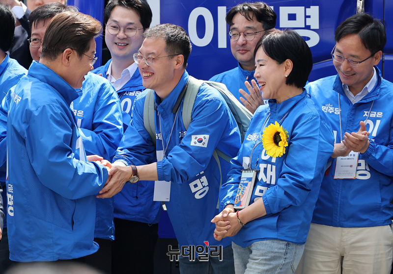 민주당에 입당한 김상욱 의원이 19일 오후 서울 용산역 광장에서 열린 이재명 더불어민주당 집중유세에서 이 대선후보와 악수를 하고 있다.